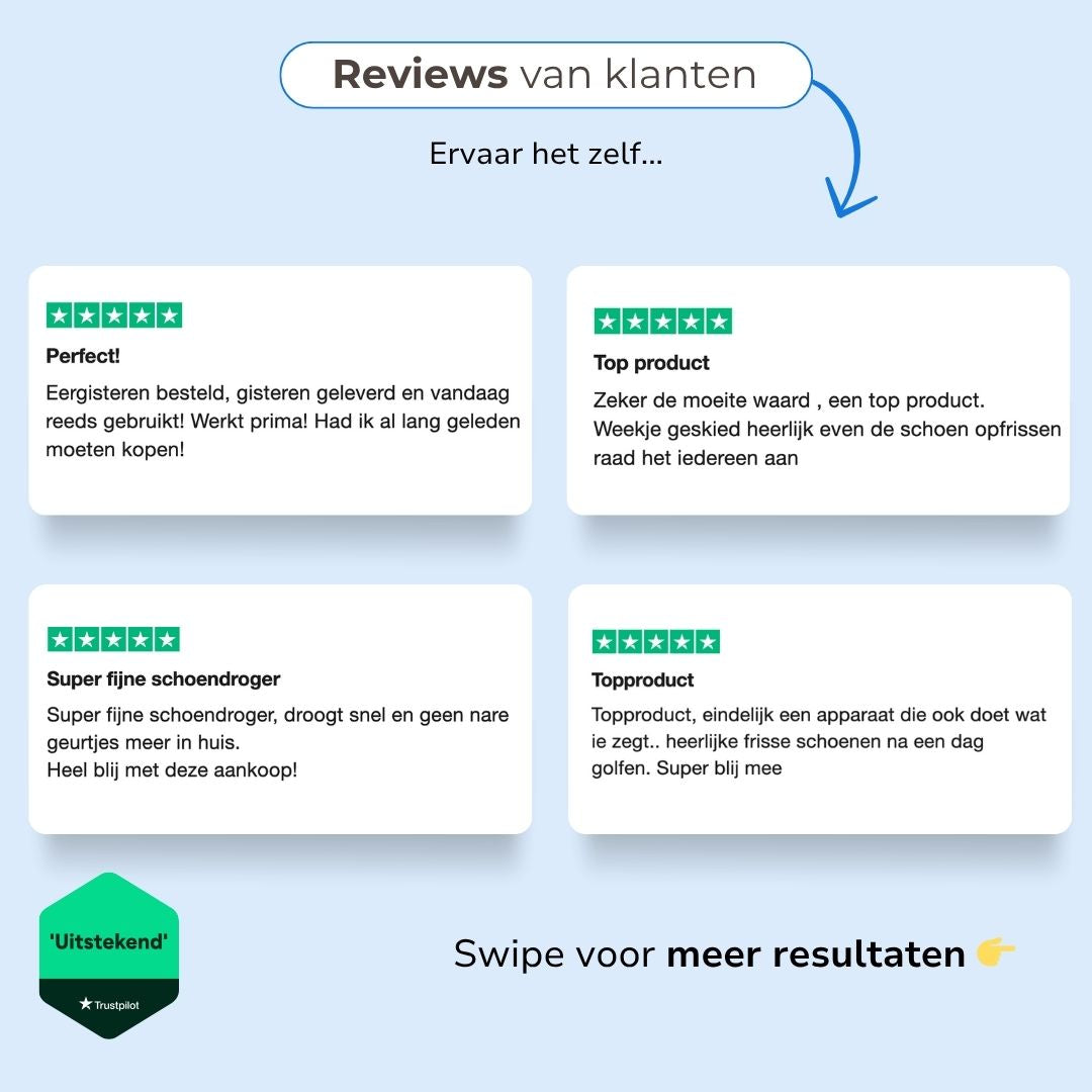 Ja, de droger is ontworpen om veilig te gebruiken op alle soorten schoenen.